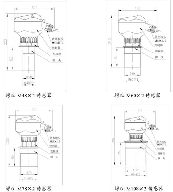 SKCYW系列超聲波液位計 ; SKCYW系列超聲波液位計是由微處理器控制的數(shù)字液位儀表。在測量中脈沖超聲波由傳感器發(fā)出,聲波經液體表面反射后被同一傳感器接收并轉換成電信號。超聲波液位計具有自動功率調整,溫度補償,抗干擾等功能。由于采用非接觸測量,被測介質幾乎不受控制,可廣泛應用于水環(huán)境、酸堿、泥漿、食品等多種環(huán)境。 1、測量流量、液位、低表壓、真空和比重 2、兩線制最大量程可達30m 3、四線制最大量程可達40m 4、最小分辨率1mm 5、LCD/LED大顯示屏 6、智能信號處理技術 7、配有高低位雙繼電器(僅四線制) 8、全塑料防腐外殼(防護等級lP67) 9、換能器結構(小量程物位計法蘭安裝時,對法蘭接管長度無要求) 10、簡單的按鍵設定參數(shù)(無需等待容器排空或加滿,無需附加的遙控器) 11、靈活的安裝方式(螺紋/法蘭、固定孔/支架) 螺紋尺寸:M48*2 M60*2 超聲波液位計技術參數(shù)