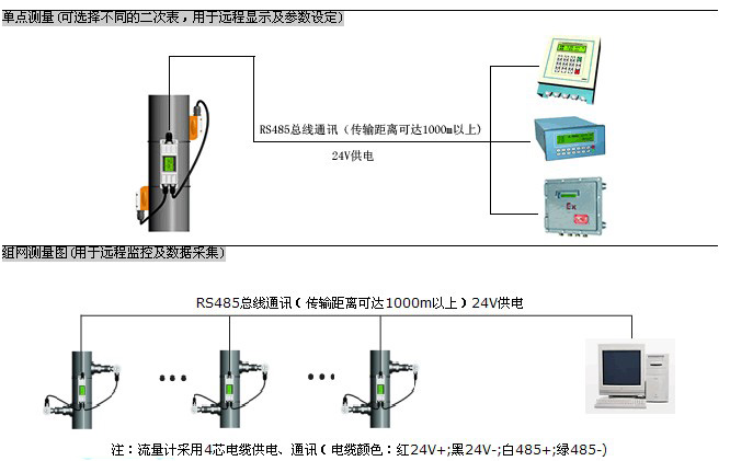 一次表與二次表(或計算機)之間采用RS-485總線通訊,采用普通電纜即可,傳輸距離可達1000米以上,組網十分方便、快捷。這種傳輸方式抗干擾能力好,解決了分體式超聲波流量計專用電纜成本高、抗干擾能力差、傳輸距離短等問題。