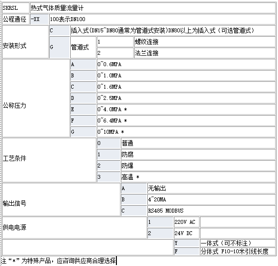 SKRSL系列熱式氣體質(zhì)量流量計 熱式氣體質(zhì)量流量計是利用熱傳導原理測量流體流量的儀表,該儀表采用恒溫差法對氣體質(zhì)量流量進行準確測量。熱式氣體質(zhì)量流量計具有體積小,數(shù)字化程度高,安裝方便,測量準確等優(yōu)點。 一、SKRSL系列熱式氣體質(zhì)量流量計產(chǎn)品優(yōu)勢: 1、特有流量數(shù)據(jù)模型算法;模糊理論控制溫度、濕度算法; 2、智能微處理器及模數(shù)、數(shù)模轉(zhuǎn)換芯片; 3、寬量程比1000:1;大口徑,低流速,壓損可忽略; 4、直接測量質(zhì)量流量,無須溫壓補償; 5、低流速測量非常靈敏; 6、設計、選型方便,安裝、使用簡便; 7、適合各類單一或混合氣體流量測量。 二、SKRSL系列熱式氣體質(zhì)量流量計產(chǎn)品特點: 1、采用鉑RTD傳感器技術 2、采用享有“平衡結構封裝”技術,介質(zhì)溫度自補償 3、特有算法,可實現(xiàn)線性、重復性、精度好 4、量程比寬1000:1,可據(jù)用戶要求可拓展 5、可實現(xiàn)大管徑小流量測量,最小流量可測低至零,分辨率0.001m/s 6、無可動部件、振動影響可忽略 7、直管段要求不高1-2D 8、與介質(zhì)的溫度、壓力無關 9、特有高溫算法,介質(zhì)溫度可達+400℃, 10、采用高濕算法,實現(xiàn)精度準確測量 11、對流量信號鍵入12點動態(tài)修正,內(nèi)置10點修正 12、在線動態(tài)校正電流/電壓輸出 13、對粉塵等小顆粒不敏感 14、在線不斷流裝卸,維護方便 三、熱式氣體質(zhì)量流量計應用場合: 1、公用工程---電﹑氣﹑ 水處理的監(jiān)控 管道的氣體;通用系統(tǒng);沼氣;煤氣;天然氣;液化氣;鍋爐預熱空氣 2、石油與天然氣工業(yè) 能量交換;填井氣回收;燃氣計量;氣體質(zhì)量分析;泄漏氣測試;天然氣測量;火炬氣的監(jiān)控 3、電力行業(yè) 燃料系統(tǒng)中氣體分配過程中的氣體測量;鍋爐及輔助系統(tǒng)中各種氣體的測量;燃氣爐中氣體測量;氫氣測量;電廠高爐的一次風、二次風的測量 4、化學行業(yè) 煙氣循環(huán)監(jiān)測;采樣系統(tǒng)中氣體流量計量;引風機的氣體流量計量;化肥廠氨氣測量 ;電池工廠各種氣體流量測量 5、冶金行業(yè) 鋼鐵廠加氣測量;煉鐵廠高爐煤氣的測量;焦化廠焦爐煤氣的測量;軋鋼廠加熱爐燃氣(高爐煤氣、焦化煤氣、天然氣等)的測量控制;熱處理淬火爐等的氫、氧、氮等氣體的控制 6、紙漿與造紙行業(yè) 廢水處理系統(tǒng)中氣體的測量;煙道流量監(jiān)控;鍋爐回收二次/三次空氣;鍋爐的燃氣和空氣送風測量 7、食品及醫(yī)藥行業(yè) 加工操作中新鮮空氣的加入;啤酒廠中的二氧化碳處理;瓶子消毒器中的熱空氣的流量;熱氧化過程中氣體流量測量;通風系統(tǒng);鍋爐進氣﹑廢氣﹑過程控制 8、環(huán)保 沼氣利用過程中的氣體測量;氯氣處理過程中氯氣氣體測量;污水處理過程中曝氣池的氣體測量;煙筒煙道排氣監(jiān)測SO2和NOX的排量 9、其他行業(yè) 工廠壓縮空氣測量;煤粉燃燒過程粉/氣配比控制燃料;水泥工業(yè)豎式磨粉機排放熱氣流量控制 四、熱式氣體質(zhì)量流量計性能指標: 1、測量范圍:0.5—100Nm/s (20℃,101.33KPa) 2、精度: ±1.5%的讀數(shù) ±1.5%滿量程 3、量程比:通常100:1(取決于標定流量的范圍) 4、管徑范圍:DN20~5000mm 5、應用范圍:適合各類單一或混合氣體。含塵、含沙、含濕氣、各種腐蝕性氣體。(乙炔氣體除外) 6、環(huán)境溫度范圍: -40℃~+85℃(無顯示); -30℃~+70℃(有顯示); 濕度小于90%RH 7、介質(zhì)溫度范圍: -40℃~+100℃;-40℃~+200℃; 8、傳感器直徑:ф3、ф2.5 9、插入式傳感器探桿直徑:ф19(標準)、ф16、ф12 10、傳感器材質(zhì):316不銹鋼、哈氏合金、鈦 11、探桿材質(zhì)(保護套):316不銹鋼(標準)、哈氏合金 12、雙向測量介質(zhì)流量 13、模擬量輸出:流量:4-20mADC,溫度:4-20mADC,最大負載:1000Ω 14、累積脈沖量輸出 15、鍵入12段非線性修正,內(nèi)置10段非線性修正 16、通訊:串口輸出RS232/RS485 17、供電電源:24VDC/600mA;220VAC/2W;110VAC/3W 18、報警:1-2路繼電器輸出、5A/220V、5A/30VDC、鍵入設定 19、大屏幕LCD顯示:七位瞬時流量,八位累積流量 20、過程壓力:1.6Mpa(最大20MPa) 21、安裝工藝形式:插入式(卡套、卡套+球閥、法蘭連接)適用于DN80以上的管道安裝,管道式(法蘭、螺紋連接)適用于DN15以上的管道安裝。 22、防爆等級:本安型(iaⅡCT5)、隔爆型(ExdⅡCT4) 23、防護等級:IP65 五、傳感器參數(shù): 管段傳感器數(shù)據(jù)表 (螺紋連接) ![]() 注:DN<20mm時,傳感器尺寸請咨詢我公司 管段傳感器尺寸表(法蘭連接) ![]() 六、口徑與流量對應表 ![]() 七、產(chǎn)品選型: ![]()