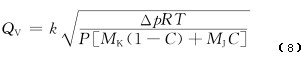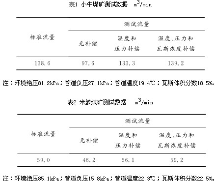 0 引言 針對瓦斯抽放管道中流量計量裝置不同的安裝環(huán)境,目前煤礦使用的流量計主要有差壓式V錐流量計和威力巴流量計、熱線式流量計。差壓式V錐流量計和威力巴流量計需要配置信號處理儀表,但市場上配置的信號處理儀表只能采集1個差壓信號用于計算瓦斯抽放管道流量,且沒有考慮環(huán)境條件變化對流量的影響,不能進(jìn)行實時補償,造成流量測量結(jié)果誤差較大。鑒此,一種具有動態(tài)補償?shù)?strong>差壓式瓦斯抽放流量儀表,可同時測試管道差壓、管道負(fù)壓、環(huán)境絕壓、管道溫度、管道瓦斯?jié)舛?個環(huán)境參數(shù),并對管道瓦斯流量測量進(jìn)行實時補償,提高了流量測量的準(zhǔn)確性。 1 測量原理及補償方法 1.1 傳感器測量原理 差壓式V錐流量計和威力巴流量計是由傳感器和信號處理儀表組成的測量裝置。傳感器產(chǎn)生一個依據(jù)流量大小而變化的差壓。具有動態(tài)補償?shù)牟顗菏酵咚钩榉帕髁績x表采集相應(yīng)管道差壓、管道負(fù)壓、環(huán)境絕壓、管道溫度和管道瓦斯?jié)舛?個環(huán)境參數(shù),用于計算流量。常用的差壓式流量計體積流量計算公式為 式中:QV為體積流量;k為傳感器的結(jié)構(gòu)系數(shù);Δp為傳感器檢測的差壓;ρ為被測介質(zhì)的密度。 在實際生產(chǎn)和測試中,k,Δp和ρ都可能造成不同程度的測量誤差。其中k取決于結(jié)構(gòu)加工精密度,出廠前通過水流量計量裝置實流標(biāo)定確定;Δp取決于差壓傳感器精度,出廠前精度通過壓力計量標(biāo)校裝置標(biāo)校;ρ取決于現(xiàn)場測試介質(zhì)狀態(tài),需要根據(jù)介質(zhì)狀態(tài)的變化進(jìn)行實時動態(tài)補償。 瓦斯抽放管道內(nèi)氣體壓力變化范圍一般為-80~20kPa,溫度變化范圍為0~40℃。管道內(nèi)氣體一般由空氣、CH4及其他烷類氣體組成,空氣和CH4比例占99%以上,因此瓦斯抽放管道內(nèi)其他氣體組分幾乎可以忽略不計,但空氣和CH4的組分比例在不停變化。由此可見,介質(zhì)密度動態(tài)補償需要從氣體壓力、溫度和濃度3方面來考慮。 1.2 儀表補償方法 理想氣體狀態(tài)方程: 式中:P為絕壓;V為體積;n為物質(zhì)的量;R為比例常數(shù);T為溫度。 摩爾質(zhì)量計算公式: M=m/n (3) 式中:M為摩爾質(zhì)量;m為質(zhì)量。 密度計算公式: ρ=m/V (4) 由式(2)—式(4)可得 ρ=PM/RT (5) 由式(1)和式(5)可得 由于管道內(nèi)氣體主要由CH4和空氣組成,所以混合氣體的摩爾質(zhì)量為 M=MK(1-C)+MJC (7) 式中:MK為空氣的摩爾質(zhì)量;MJ為CH4的摩爾質(zhì)量;C為管道氣體中CH4比例。 由式(6)和式(7)可得