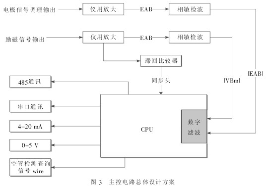 0引言 挖泥船電磁流量計用來指導(dǎo)挖泥船操作施工,防止堵管、悶耙,與密度測量設(shè)備一起使用構(gòu)成產(chǎn)量計,為施工操作與管理提供決策數(shù)據(jù),有利于提高施工效率。其測量介質(zhì)為液固兩相流體,有別于通常意義下的單一介質(zhì),測量難度大大增加。而電磁流量計(EMF)是根據(jù)電磁感應(yīng)定律制成的一種測量導(dǎo)電性流體流量的儀表[1]。與現(xiàn)有各種流量儀表相比,其直線性好、測量精度高、測量范圍和適用范圍廣、耐腐蝕性能強,可以解決其他流量計不易解決的問題,如臟污流、腐蝕流等的測量[2]。 目前國內(nèi)應(yīng)用于挖泥船的電磁流量計大多存在零點漂移、轉(zhuǎn)換精度不高、流速不穩(wěn)、空管檢測易失常等諸多問題。對此,我們進(jìn)行了相關(guān)研究并提出相應(yīng)改進(jìn)措施,現(xiàn)已研發(fā)出一種專門用于挖泥船的電磁流量計,在耙吸式挖泥船上成功應(yīng)用,取得了很好的效果。本文通過信號處理和空管檢測功能詳細(xì)介紹該新型挖泥船電磁流量計。 1電磁流量計工作原理 電磁流量計分為傳感器和轉(zhuǎn)換器兩部分。傳感器是把流過管道內(nèi)的導(dǎo)電流體的流速信號轉(zhuǎn)換為電信號,轉(zhuǎn)換器是把傳感器輸出的電信號進(jìn)行有用信號識別提取并進(jìn)行相關(guān)處理,用于主機顯示,主要由勵磁電路、信號調(diào)理電路、微處理電路等部分組成。圖1為傳感器工作原理示意圖。 根據(jù)法拉第電磁感應(yīng)定律,當(dāng)一導(dǎo)體在磁場中運動而切割磁力線時,在導(dǎo)體兩端便會產(chǎn)生感應(yīng)電動勢。設(shè)在均勻磁場中,垂直于磁場方向有一個直徑為D的管道。管道由不導(dǎo)磁材料制成,內(nèi)表面加絕緣襯里。當(dāng)導(dǎo)電的液體在管道中流動時,導(dǎo)電液體就切割磁力線,因而在磁場及流動方向垂直的方向?qū)a(chǎn)生感應(yīng)電動勢。如果在管道截面垂直于磁場的直徑兩端安裝一對電極,只要管道內(nèi)流速υ為軸對稱分布,兩極之間就會產(chǎn)生感應(yīng)電動勢[3],此感應(yīng)電動勢與流速具有線性關(guān)系。其表達(dá)式為: E=K·B·D·V(1) 式中:V為測量管道內(nèi)截面上的平均流速(m/s); K為儀表常數(shù); D為測量管內(nèi)直徑(m); B為磁感應(yīng)強度(T)。 轉(zhuǎn)換器將此感應(yīng)電動勢測出,再根據(jù)線性關(guān)系式即可得出流速信號。圖2為電磁流量計整體設(shè)計示意圖。 考慮到傳感器出來的微弱信號容易在傳輸線上損耗,故而電極信號調(diào)理板和空管檢測功能板就近放置于傳感器出線口,調(diào)理后經(jīng)屏蔽線傳輸至轉(zhuǎn)換器上的主控電路。 結(jié)構(gòu)上管道本身就是個大的屏蔽體,防止勵磁線圈磁場泄露,信號采用屏蔽線傳輸,減少線與線之間信號干擾,以及空間傳播的干擾,保證信號的完整性。 電路上采用雙核主從式控制,方便流速測量及其空管檢測,克服了以往電磁流量計需要配合密度計來使用的缺陷;同時利用微機技術(shù),使其各方面性能大大提高,更加智能化,更加便于管理施工。 2勵磁方式的合理選擇 目前國產(chǎn)挖泥船流量計大多采用低頻方波勵磁方式,其主要特點是能避免零點漂移及無正交干擾,抗同相干擾能力較好[4]。但對于液固兩相流體而言,當(dāng)固體顆粒撞擊電極,表面電位變化形成尖峰狀噪聲,信號呈現(xiàn)大幅度波動。而低頻方波勵磁不能從硬件技術(shù)上消除這種由于沖擊造成的干擾,要實現(xiàn)測量結(jié)果的穩(wěn)定,只能通過調(diào)整勵磁頻率外加軟件手段加以消除,但有兩方面的缺陷: (1)挖泥船上工況復(fù)雜,挖泥工況與合適勵磁頻率匹配問題很難完美解決,只能通過現(xiàn)場不斷調(diào)試較合適的頻率參數(shù)。同一工地不同土質(zhì)都需要改變頻率參數(shù),以目前的現(xiàn)場條件及技術(shù)水平,要做到這一步非常困難,目前基本上采用大體上可測量的單一頻率。 (2)采用軟件濾波降低由沖擊噪聲產(chǎn)生的波動幅度,波動幅度平滑程度越高,則測量結(jié)果的真實性和實時性就越差,很多情況下會導(dǎo)致測量結(jié)果失真,尤其當(dāng)高流速、固體含量高、大顆粒的工況。 而采用工頻(50Hz)電源交流勵磁方式,消除了電極表面的極化于擾,抗固體顆粒撞擊電極形成尖峰狀噪聲能力強。由于磁場是交變的,所以輸出信號也是交變信號,放大和轉(zhuǎn)換低電平的交流信號要比直流信號容易得多。但值得注意的是,用交流勵場會帶來一系列的電磁干擾問題。例如正交干擾、同相干擾等,這些干擾信號與有用的流量信號混雜在一起。因此,如何正確區(qū)分流量信號與干擾信號,并如何有效地抑制和排除各種干擾信號,就成為交流勵磁電磁流量計成功應(yīng)用于液固兩相流體測量的關(guān)鍵點。 3信號處理的改進(jìn) 液固兩相流介質(zhì)(尤其含大塊顆粒的情況)與測量管道的摩擦及對測量元件不定時的沖擊,會產(chǎn)生大量強度的干擾信號,常規(guī)信號處理技術(shù)會造成測量結(jié)果大幅度波動、回零等現(xiàn)象,情況嚴(yán)重時會失去測量意義。對于信號處理有兩個難點:第一,如何將微弱的流量信號與干擾信號區(qū)分開來;第二,如何保證測量的實時性和正確率。解決干擾的辦法: (1)首先需要設(shè)計合理的回路結(jié)構(gòu),利用信號調(diào)理電路減