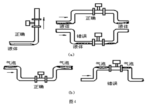 d)測量液體時,為了保證管內(nèi)充滿液體,所以在垂直或傾斜管道安裝儀表時,應該保證液體流動方向從下而上。若管道內(nèi)含少量氣體,為了防止氣體進入儀表測量管,儀表應安裝在管線的較低處如圖4b所示